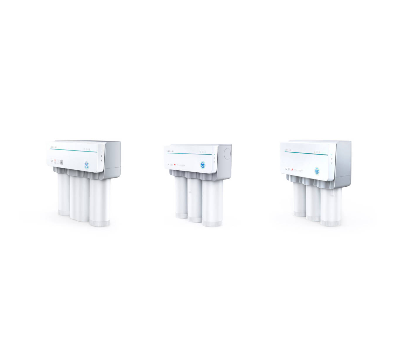 What we did: The look of the Ax purifiers had to unite aesthetic factors of the product design language as well as individual design characteristics imposed by the filters’ unique structural architecture, while somewhat resembling the form factor of Angel’s old A6 product. In order to achieve the desired light-bodied appearance we merged the vertically layered look of Angel’s product design language with the newly developed curved middle surface, thus avoiding an oodly massive enclosure at the top and emphasising Angel’s “Scientifically clean water”-feel. Assessing the usually packed spatial conditions of the sink cabinet in different households provided us great insights to significantly decrease the Ax’ spatial footprint. Ensuring all-around accessibility of the UI when placed sideways or alongside the cabinet walls we rethought the UI completely, placing detailed status indicators onto the front’s back-lit branding line, while buttons and an additional multi-purpose status light were integrated onto the enclosure’s right hand side.