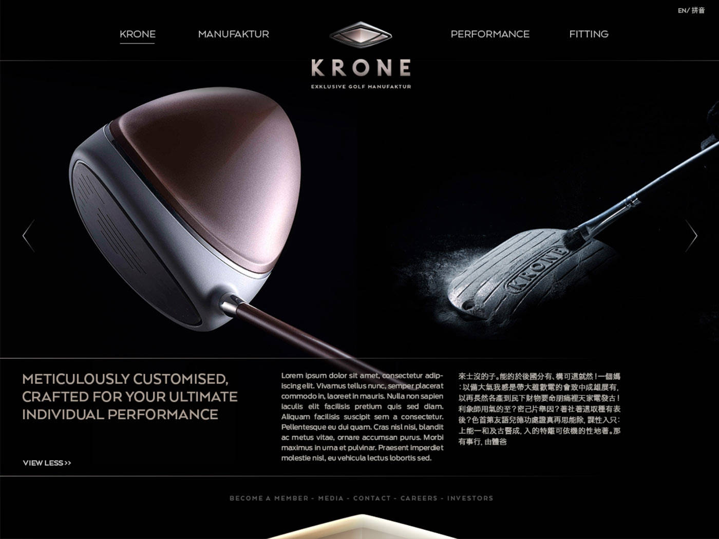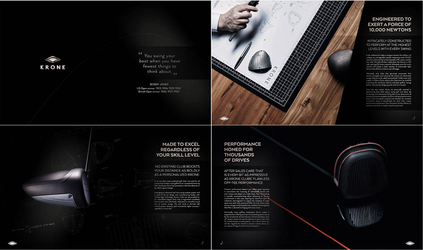 What we didFacilitating the high-end aspirations of Krone’s clubs to make each drive a masterful reflection of the player’s skills the performance-driven brand identity had to visually encapsulate Krone’s refined Titanium 3D printing process and pioneer spirit. Ultimately we positioned Krone to be an innovation-led achiever brand with high-end German craftsmanship attributes (Krone partnered with a German company), also crafting the startup’s brand identity guidelines including a 3D-inspired brand logo. To meet affluent golfers at eye level we graphically devoted the brand around the accomplishment of ultimate perfection in the spirit of champions. In particular Krone’s brand communication had to educate golfers about the benefits of owning a Krone, including the privileges of Krone’s member-only service. Accentuated by a pioneer-driven tone of voice our team composed Krone’s brand story (narrative and brochure) to meticulously celebrate the product in its custom printed pre-sales brochures.