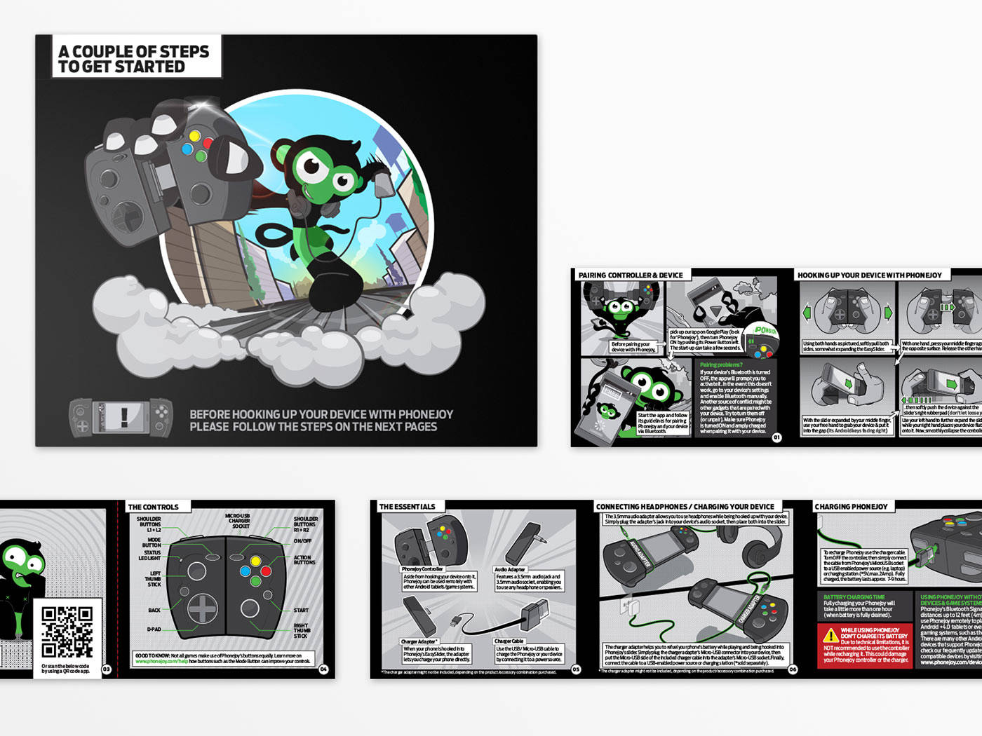 What we didInspired by Phonejoy’s ape mascot we created cartoon-styled visual theme, completely based on mono-black stencil graphics. Enabling retailers to stack the boxes in varying combinations we designed the box’ front in negative black and its rear the contrasting positive, ideal to print on recycled stock of corrugated Kraft board. We then developed a 2-part box structure that would reveal a few guidelines in its interior despite being entirely printed on the board’s upper side. In conjunction to the box we also designed a playful manual based on the cartoons Phonejoy occasionally published to amaze its fans. The sustainable box was praised in many unboxing videos and reviews, shared hundreds of times.